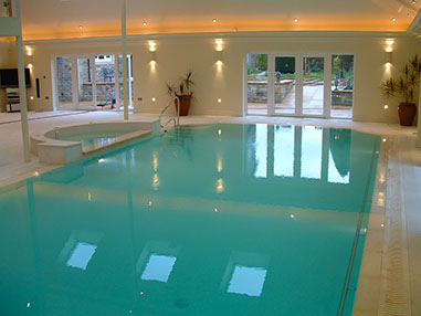 Note the 'slot' at the end of the pool. The motorised pool cover deploys from this location. The cover is an essential feature of high end indoor pools as it helps to maintain water temperature and reduce evaporation