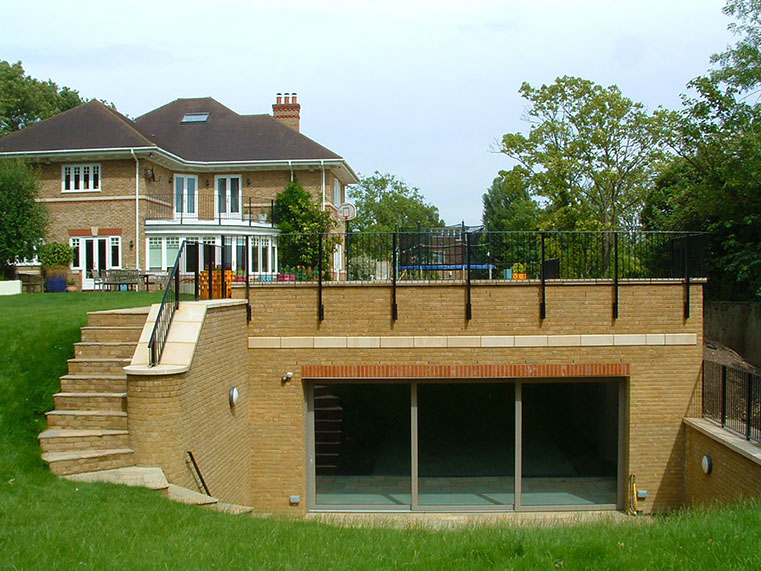 Structure is clad with brickwork to match the existing house. Steps link upper and lower garden levels.